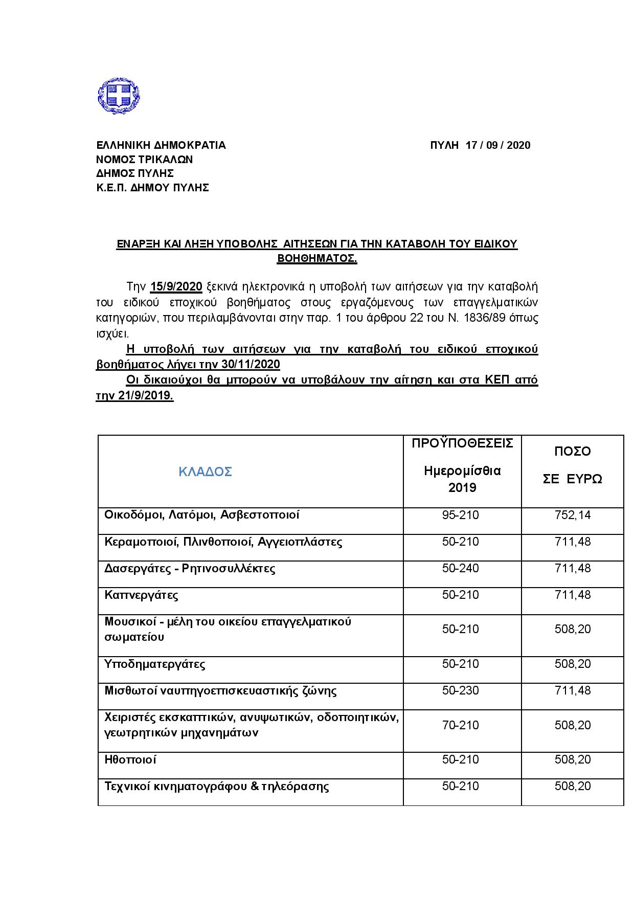 ΕΝΑΡΞΗ ΚΑΙ ΛΗΞΗ ΥΠΟΒΟΛΗΣ ΑΙΤΗΣΕΩΝ ΓΙΑ ΤΗΝ ΚΑΤΑΒΟΛΗ ΤΟΥ ΕΙΔΙΚΟΥ ΒΟΗΘΗΜΑΤΟΣ.