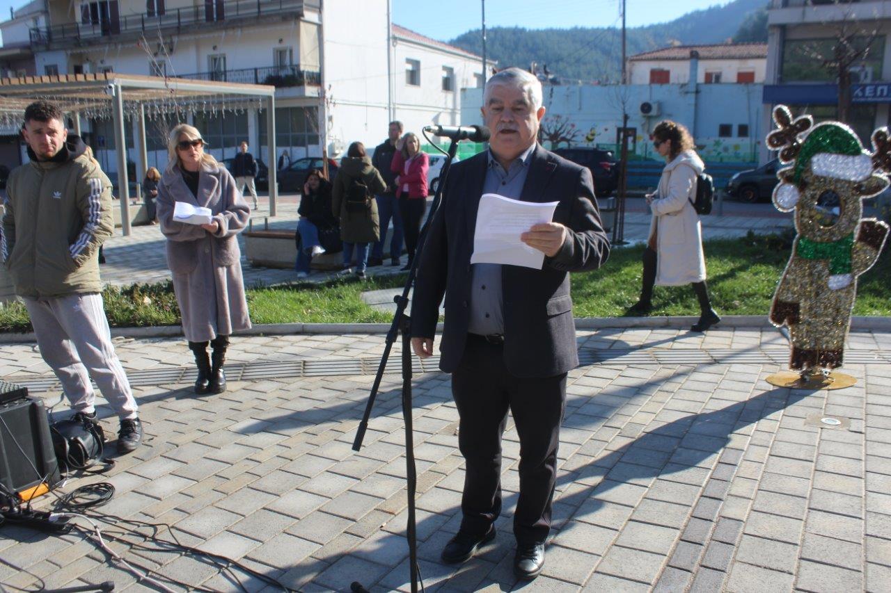 Αξιότιμε κ. Διευθυντά της Πρωτοβάθμιας Εκπαίδευσης κ. Τρικάλη, αγαπητά παιδιά των Δημοτικών Σχολείων του Δήμου Πύλης, αγαπητοί εκπαιδευτικοί γονείς και συμπολίτες. Με ιδιαίτερη χαρά σας μεταφέρω του θερμούς χαιρετισμούς του Δημάρχου Πύλης ο οποίος λόγω ανειλημμένων υποχρεώσεων απουσιάζει καθώς και τις ευχές του για καλή επιτυχία στην σημερινή Χριστουγεννιάτικη εκδήλωση με τον ξεχωριστό φιλανθρωπικό της χαρακτήρα. Η σημερινή παρουσία και συμμετοχή όλων των παιδιών των Δημοτικών Σχολείων του Δήμου μας γεμίζει την πλατεία με χαμόγελα, ελπίδα και το αληθινό νόημα των Χριστουγέννων, την αγάπη, την προσφορά και την αλληλεγγύη. Αξίζουν θερμά συγχαρητήρια στην Διεύθυνση Πρωτοβάθμιας Εκπαίδευσης, στην Ιερά Μητρόπολη Τρίκκης ,Γαρδικίου και Πύλης, καθώς και σε όλους συνέβαλαν στην διοργάνωση αυτής της όμορφης γιορτής. Εύχομαι καλά Χριστούγεννα με υγεία, χαρά και αισιοδοξία.