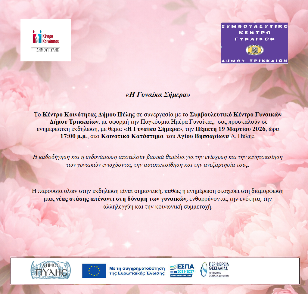 Το Κέντρο Κοινότητας Δήμου Πύλης σε συνεργασία με το Συμβουλευτικό Κέντρο Γυναικών Δήμου Τρικκαίων, με αφορμή την Παγκόσμια Ημέρα Γυναίκας, σας προσκαλούν σε ενημερωτική εκδήλωση, με θέμα: «Η Γυναίκα Σήμερα», την Πέμπτη 19 Μαρτίου 2026, ώρα 17:00 μ.μ., στο Κοινοτικό Κατάστημα του Αγίου Βησσαρίωνα Δ. Πύλης.