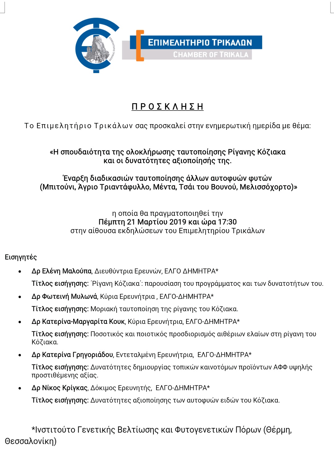 «Η σπουδαιότητα της ολοκλήρωσης ταυτοποίησης Ρίγανης Κόζιακα και οι δυνατότητες αξιοποίησής της.