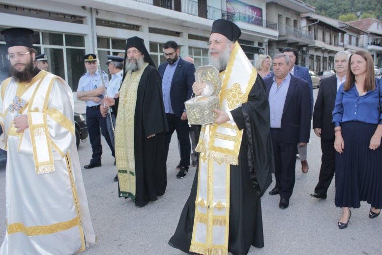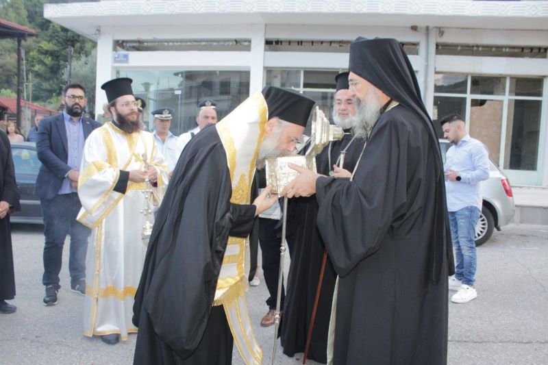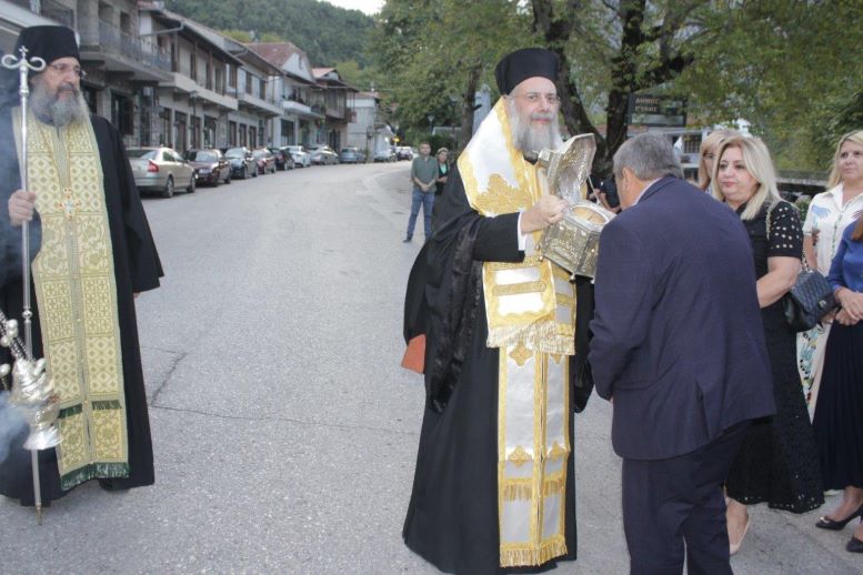 την οποία κόμισαν οι Μοναχοί από το Μοναστήρι του Αγίου Βησσαρίωνος και παρέλαβε ο Σεβασμιότατος Μητροπολίτης Τρίκκης-Γαρδικίου και Πύλης κ. κ. Χρυσόστομος, έμπροσθεν της εισόδου του Δημαρχείου Πύλης, παρουσία του κλήρου και πλήθος λαού, του Δημάρχου Πύλης κ. Κων/νου Μαράβα, της Αντιπεριφερειάρχη Τρικάλων κ. Χρύσας Ντιντή, εκπροσώπων της Αστυνομίας και Πυροσβεστικού Κλιμακίου Πύλης, Αντ/ρχων και πολλών δημοτικών συμβούλων.