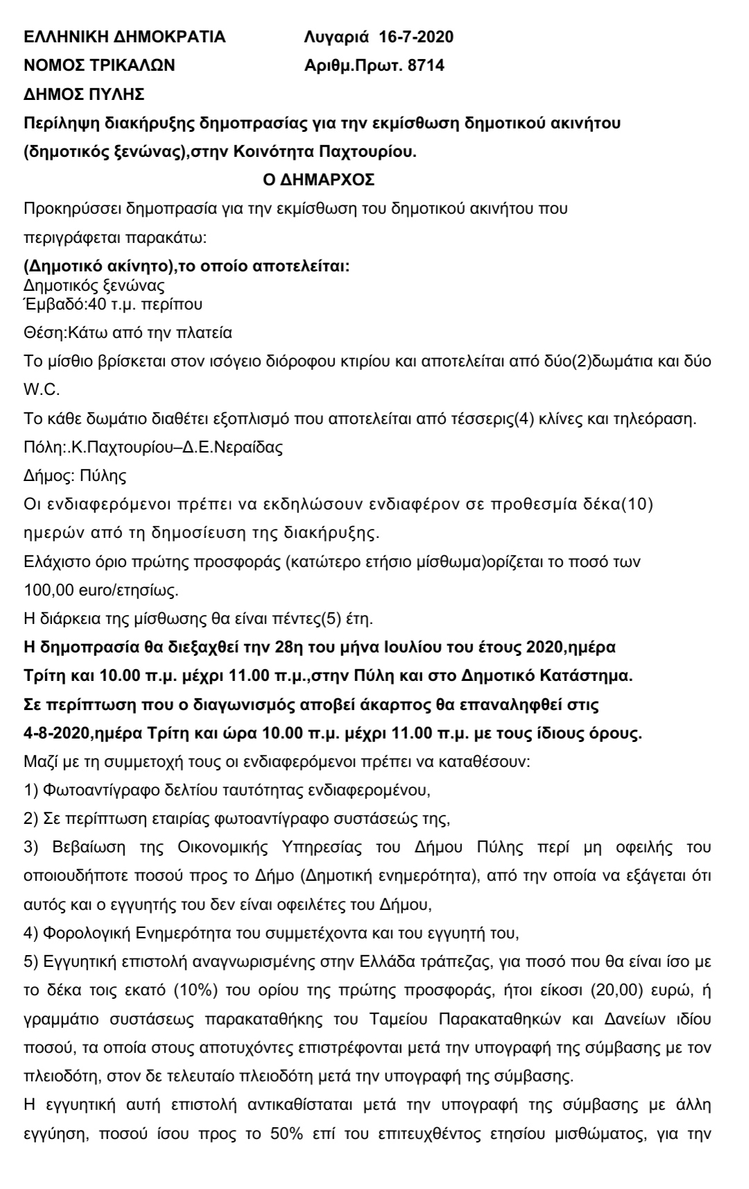 Περίληψη διακήρυξης δημοπρασίας για την εκμίσθωση δημοτικού ακινήτου (δημοτικός ξενώνας),στην Κοινότητα Παχτουρίου.