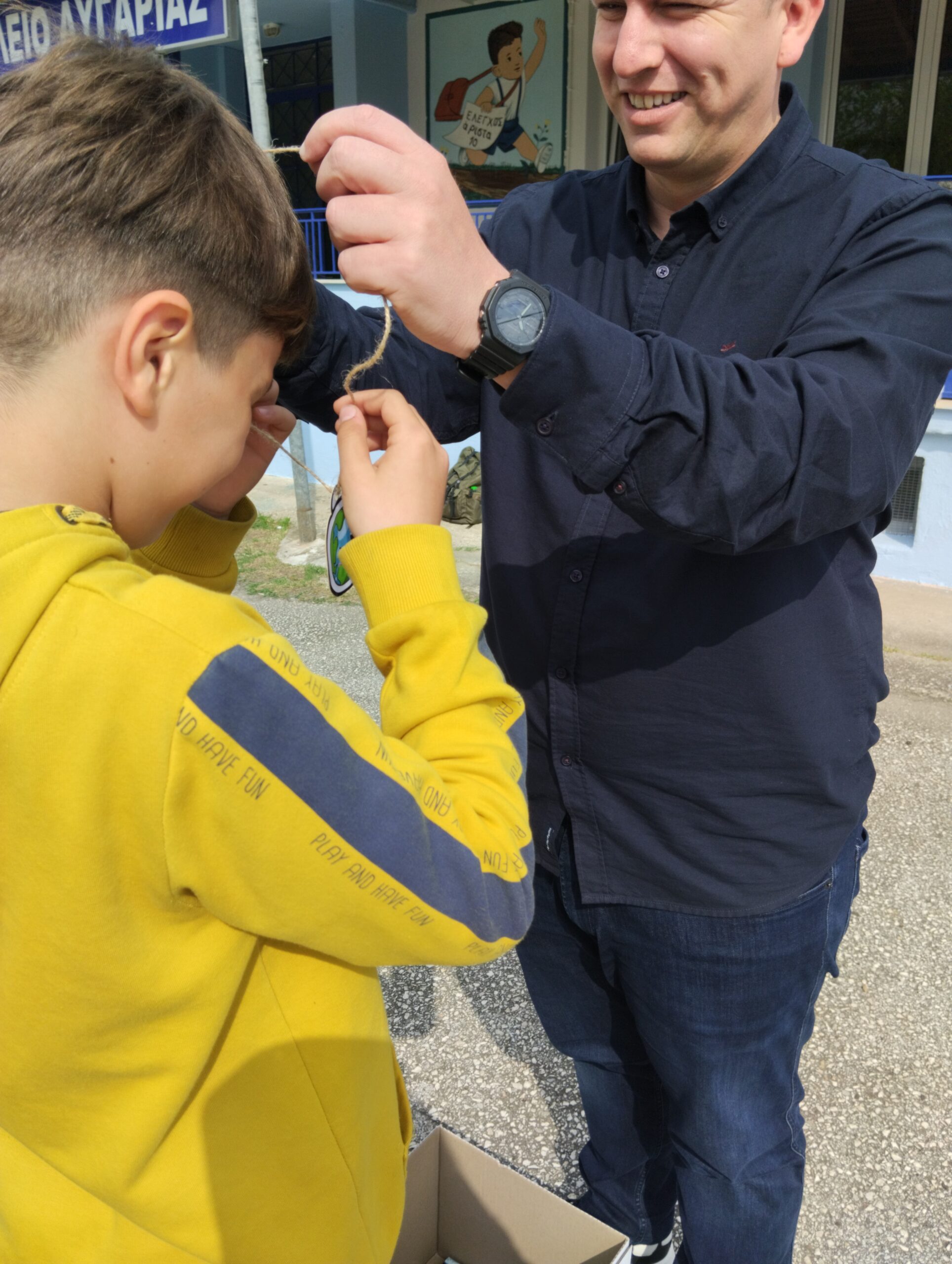 Από την πλευρά του Δήμου Πύλης οι υπάλληλοι του Αυτ.Τμήματος Τοπ.Οικ.Ανάπτυξης Κώστας Παπαδόπουλος και Έφη Φωτάκη παρουσίασαν στα παιδιά στοιχεία για το Γεωπάρκο Μετεώρων-Πύλης, τον τρόπο που σχηματίστηκε το Γεωπάρκο, γεωλογικά στοιχεία της περιοχής με κατανοητό τρόπο και τον «μαθητή – πρεσβευτή» του Γεωπάρκου στο σχολείο της Λυγαριάς. Στη συνέχεια έγινε παρουσίαση στοιχείων για την Ημέρα της Γης, καλές πρακτικές όπως η επαναχρησιμοποίηση υλικών, η ανακύκλωση, η οικονομία φυσικών πόρων κ.α. που μπορεί ο καθένας να εφαρμόσει ανεξάρτητα από την ηλικία του με γνώμονα την προσωπική του ευθύνη και την ευαισθησία που πρέπει να δείχνει στο θέμα της προστασίας του πλανήτη μας. Τα παιδιά με σύμμαχο τον καλό καιρό, βγήκαν στο προαύλιο όπου έπαιξαν παιχνίδια σχετικά με την ανακύκλωση και τις καλές πρακτικές και με κάθε επιτυχή απάντηση αλλά και για τη συμμετοχή τους, τους απονεμήθηκε το «Δίπλωμα του Καλύτερου και της Καλύτερης Προστάτη της Γης» και ένα χάρτινο μετάλλιο κατασκευασμένο από επαναχρησιμοποιούμενο χαρτί.
