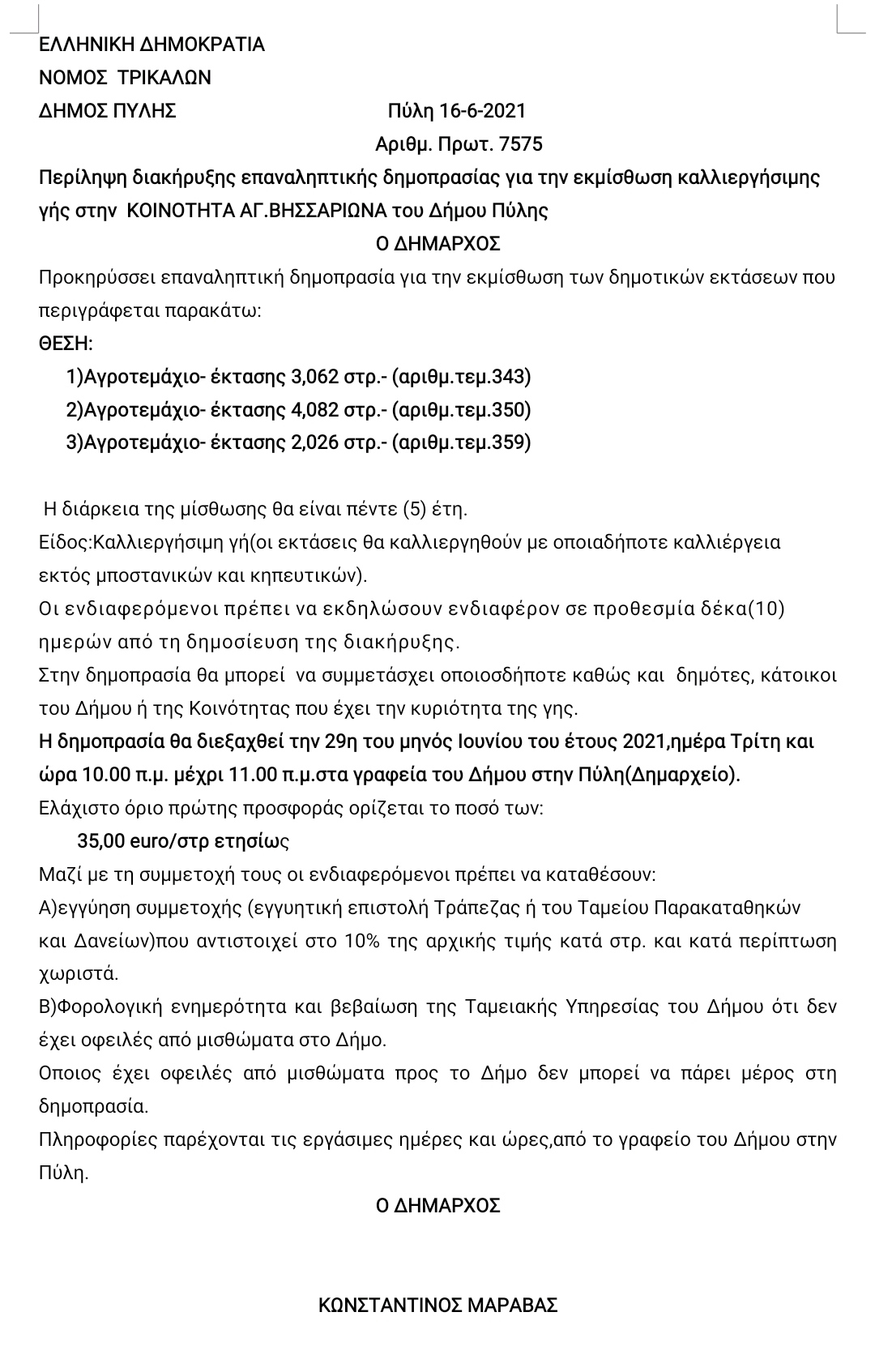 Περίληψη διακήρυξης επαναληπτικής δημοπρασίας για την εκμίσθωση καλλιεργήσιμης γής στην ΚΟΙΝΟΤΗΤΑ ΑΓ.ΒΗΣΣΑΡΙΩΝΑ του Δήμου Πύλης