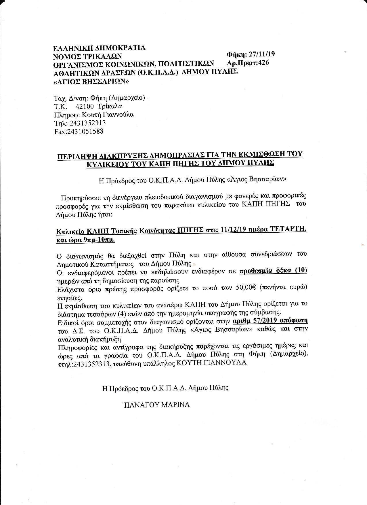 Περίληψη Διακήρυξης Δημοπρασίας για την εκμίσθωση του Κυλικείου του ΚΑΠΗ Πηγής του Δήμου Πύλης