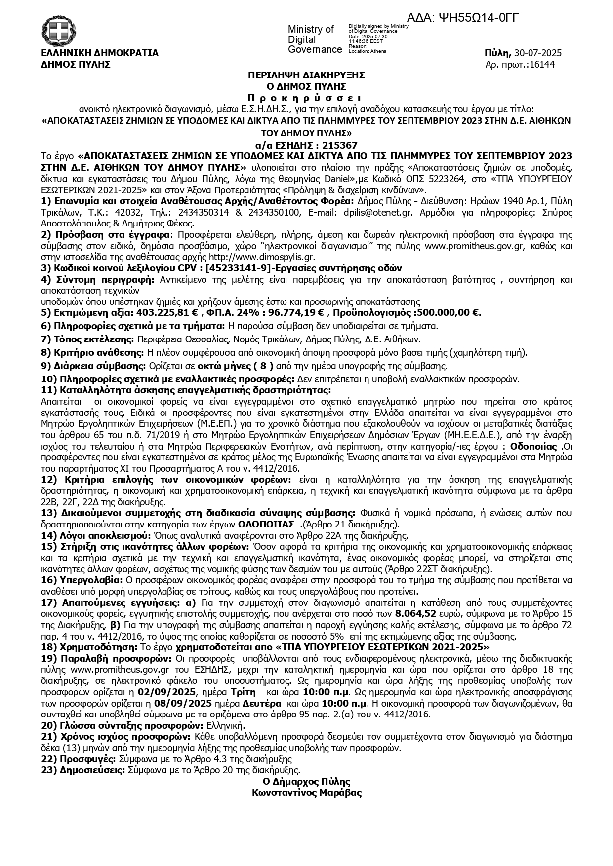 Περίληψη διακήρυξης για το έργο με τίτλο “Αποκαταστάσεις ζημιών σε υποδομές και δίκτυα από τις πλημμύρες του Σεπτεμβρίου 2023 στην Δ.Ε. Αιθήκων του Δήμου Πύλης”