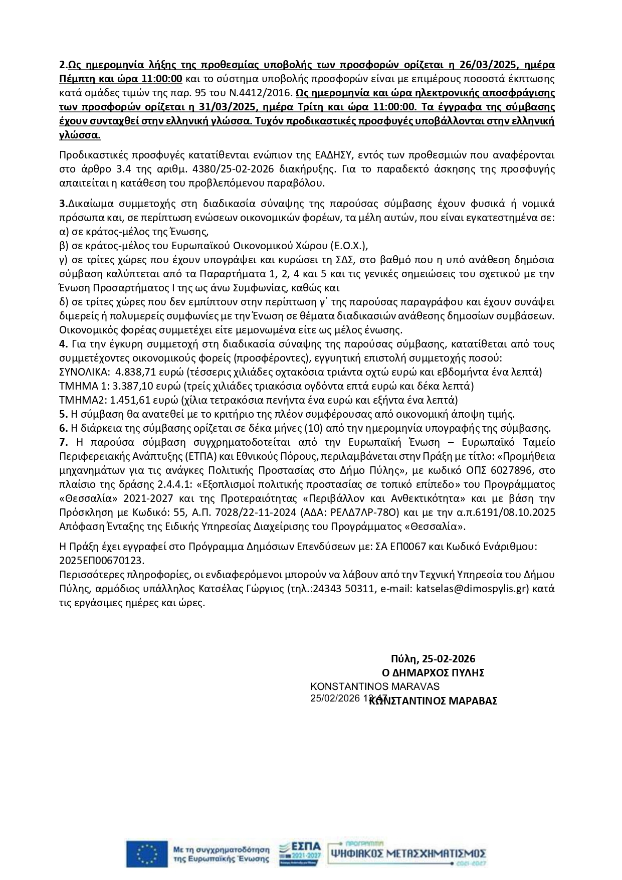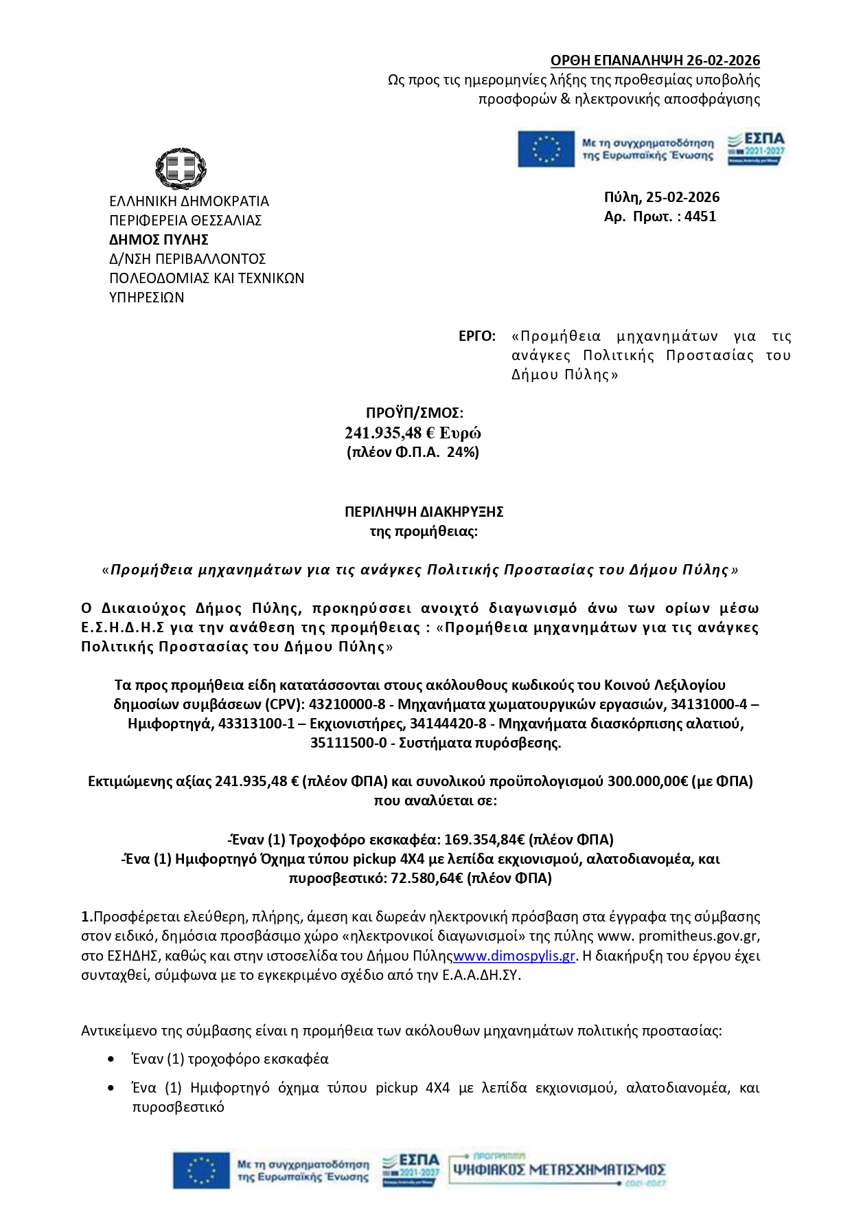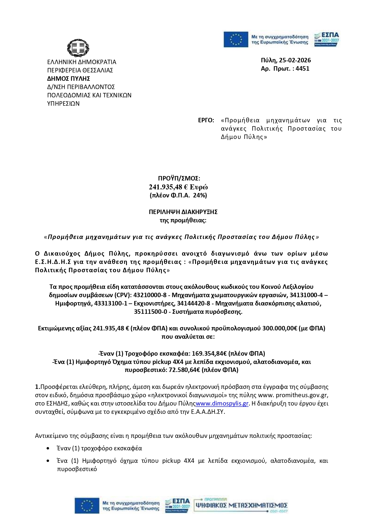 Περίληψη διακήρυξης για το έργο με τίτλο «Προμήθεια μηχανημάτων για τις ανάγκες Πολιτικής Προστασίας του Δήμου Πύλης»