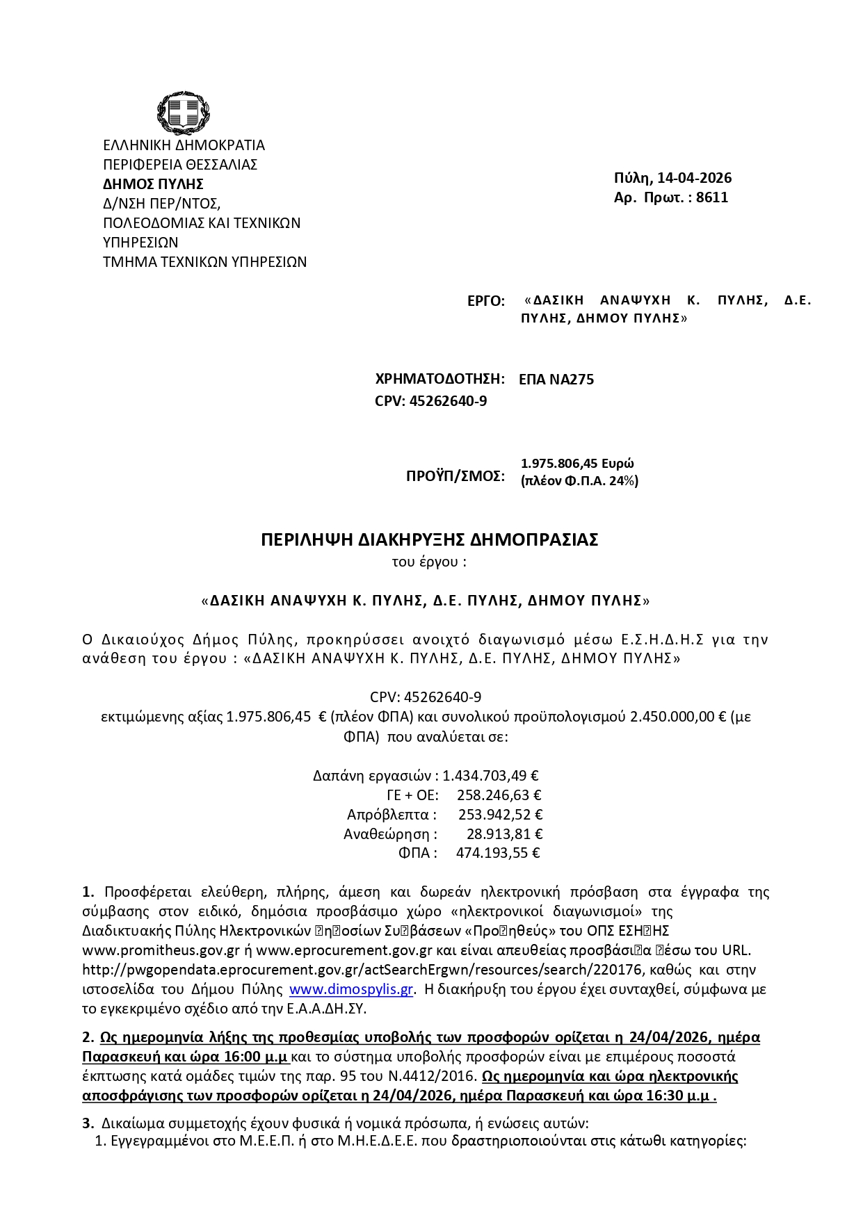 Περίληψη διακήρυξης για το έργο με τίτλο «Δασική Αναψυχή Κ. Πύλης, Δ.Ε. Πύλης, Δήμου Πύλης»