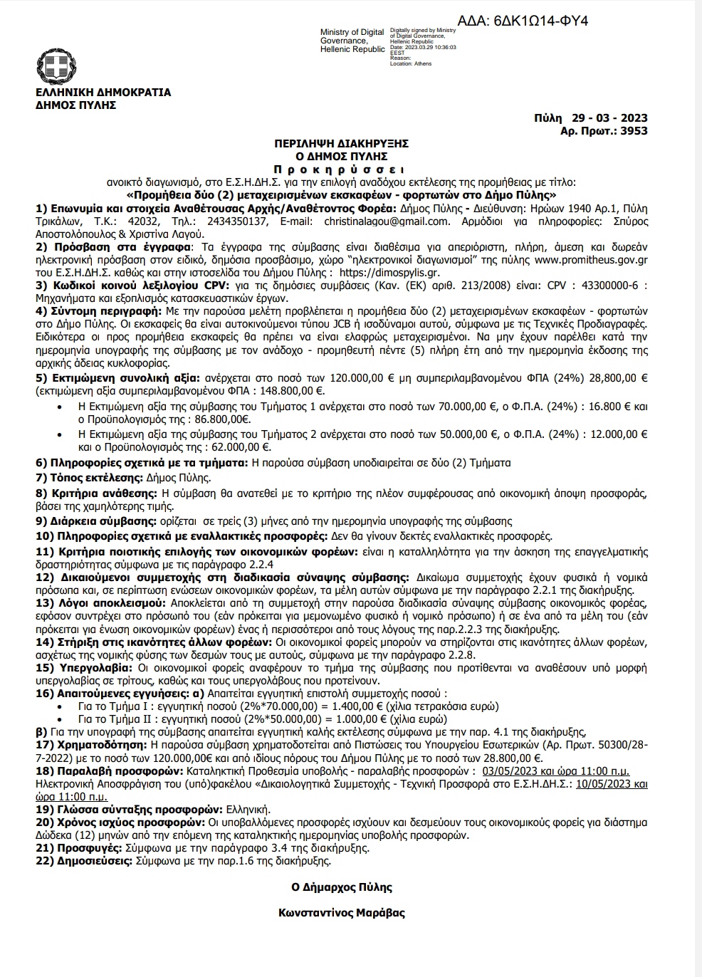 ΔΙΑΚΗΡΥΞΗ ΠΡΟΜΗΘΕΙΑΣ 2 ΜΕΤΑΧΕΙΡΙΣΜΕΝΩΝ ΕΚΣΚΑΦΕΩΝ ΚΗΜΔΗΣ