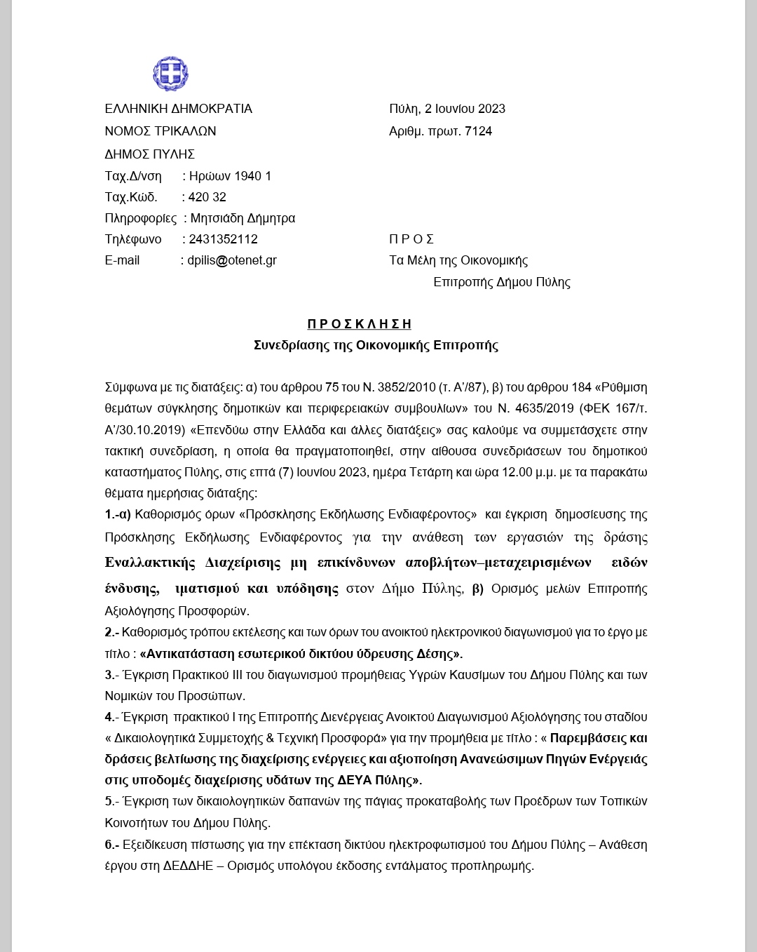 Πρόσκληση 8ης τακτικής συνεδρίασης του Οικονομικής Επιτροπής του Δήμου Πύλης (Τετάρτη 07.06.2023 ώρα 12:00)