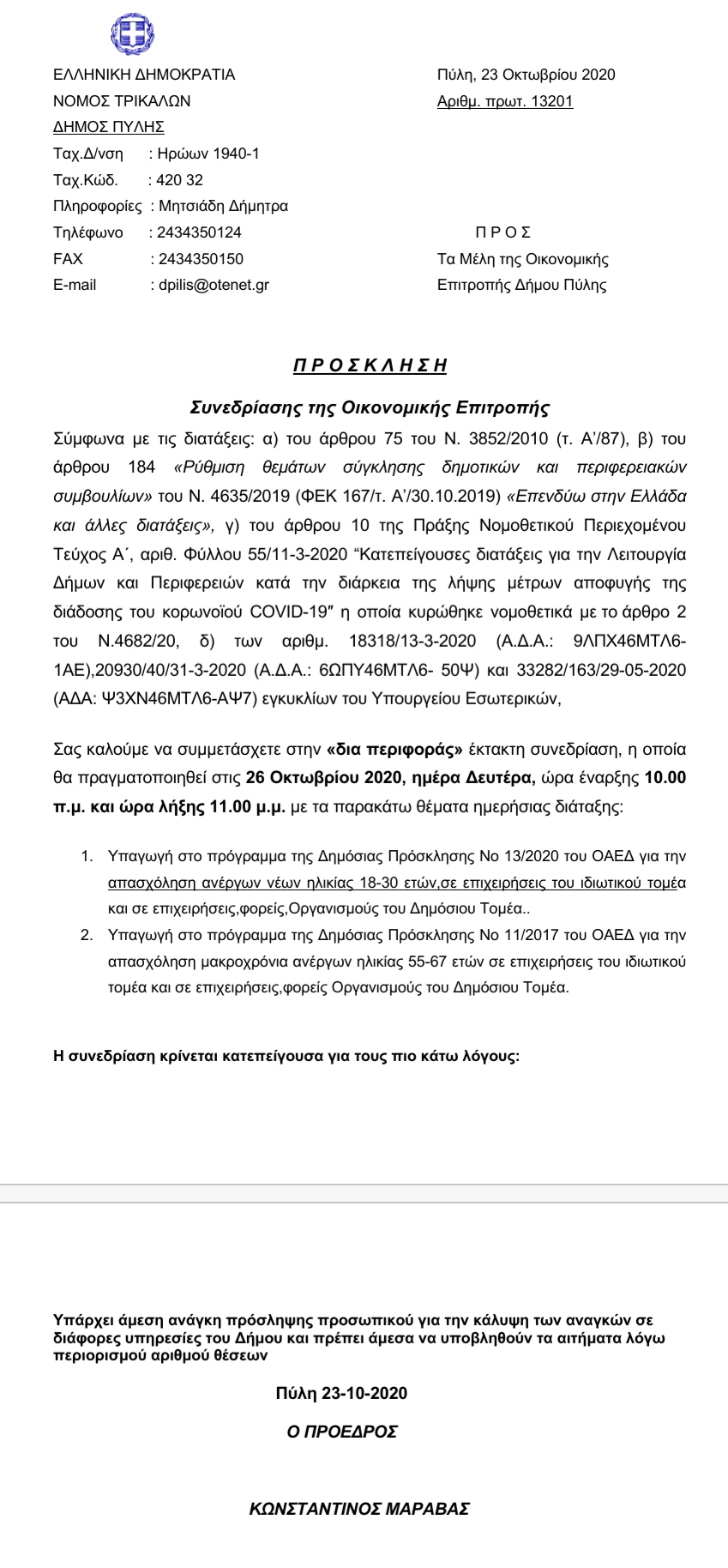 «Πρόσκληση 16ης Tακτικής συνεδρίασης της Οικονομικής Επιτροπής του Δήμου Πύλης (26-10-2020 και ώρα 10.00 μ.μ)