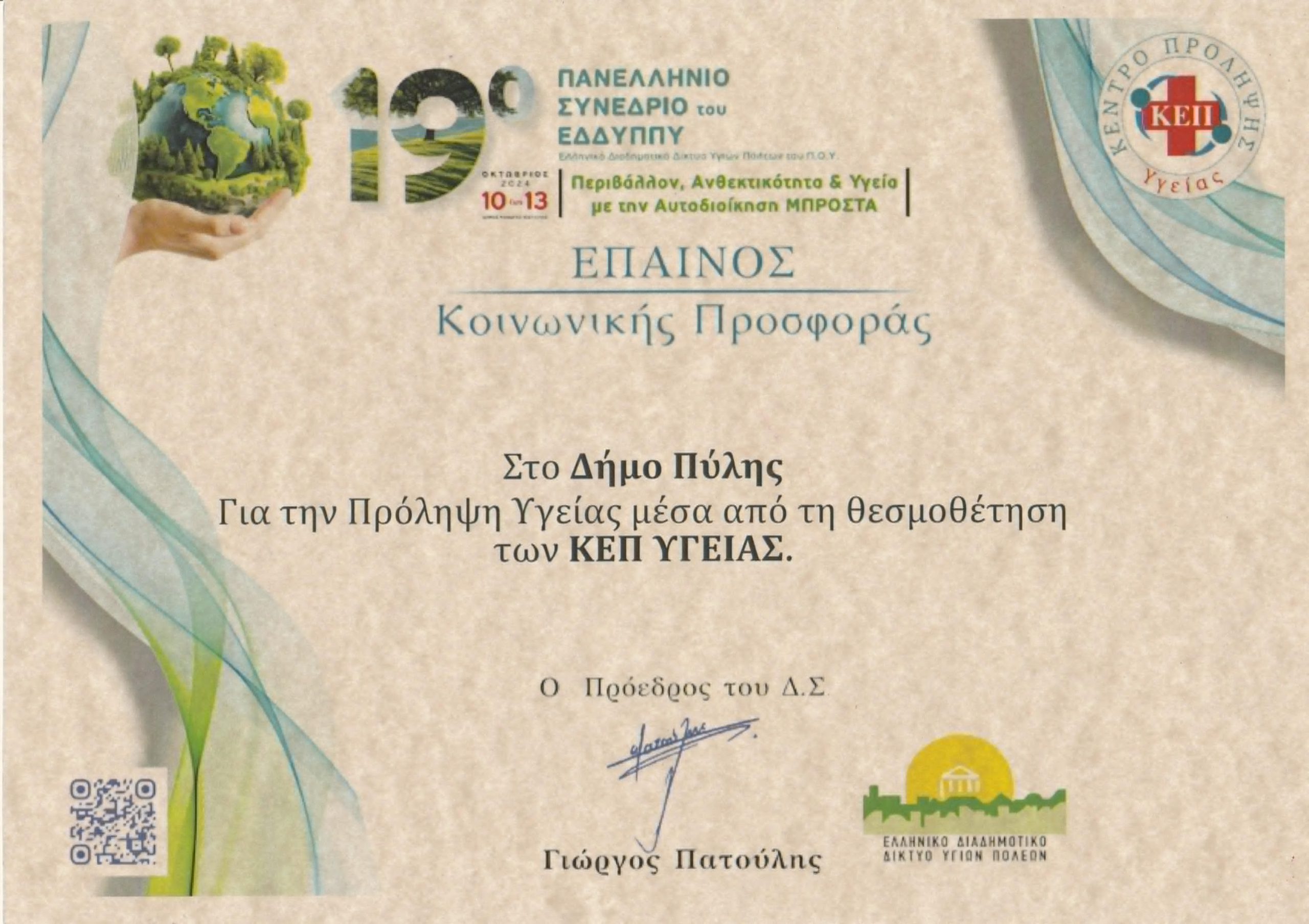 Στο πλαίσιο του συνεδρίου, πραγματοποιήθηκε βράβευση για τους Δήμους – μέλη των Εθνικών Δικτύων 2019-2024, όπως και του Δήμου Πύλης, για την κοινωνική προσφορά στην Πρόληψη Υγείας, μέσα από τη θεσμοθέτηση του ΚΕΠ Υγείας Πύλης, εκπληρώνοντας τα κριτήρια Π.Ο.Υ.