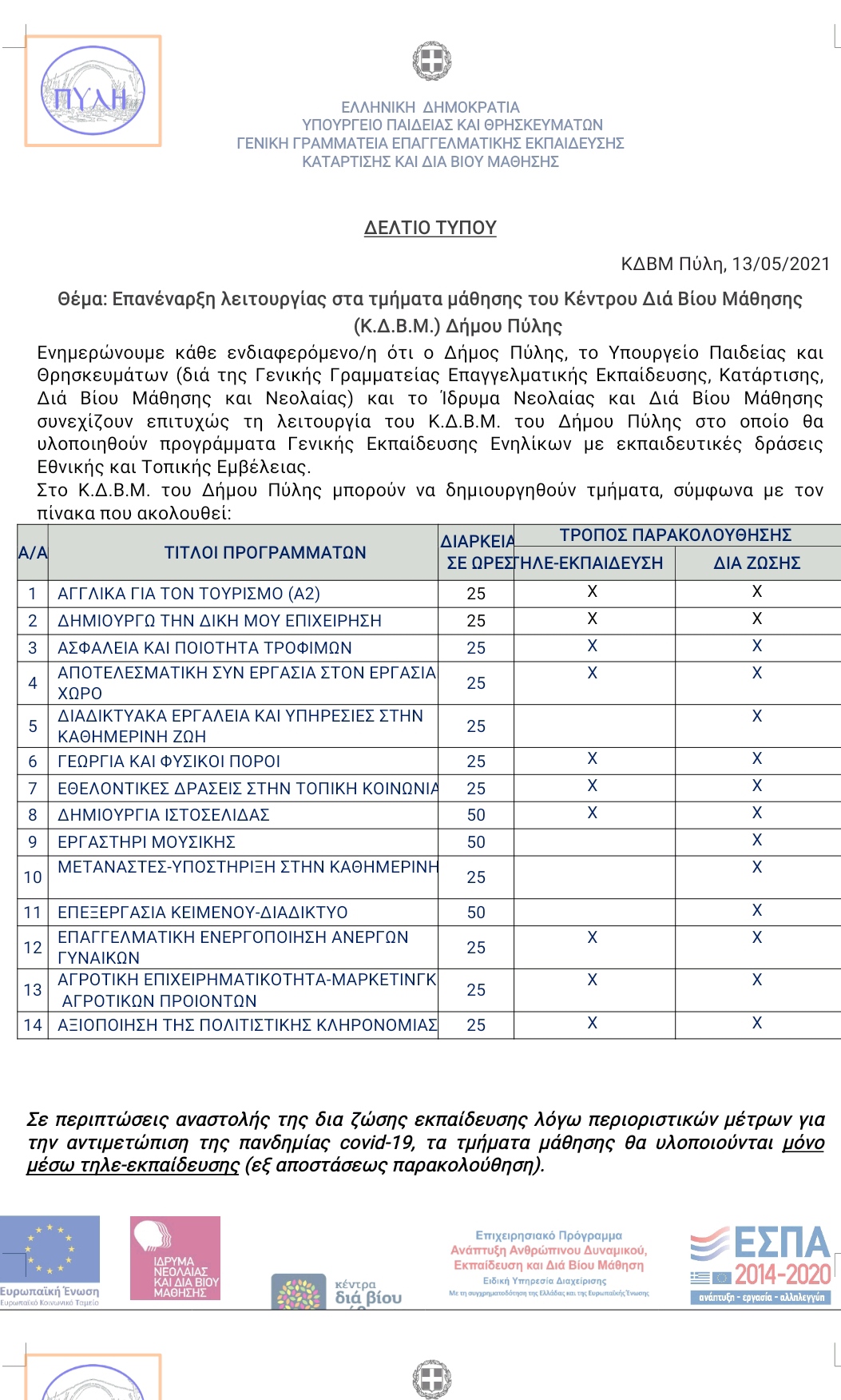 Θέμα: Επανέναρξη λειτουργίας στα τμήματα μάθησης του Κέντρου Διά Βίου Μάθησης (Κ.Δ.Β.Μ.) Δήμου Πύλης