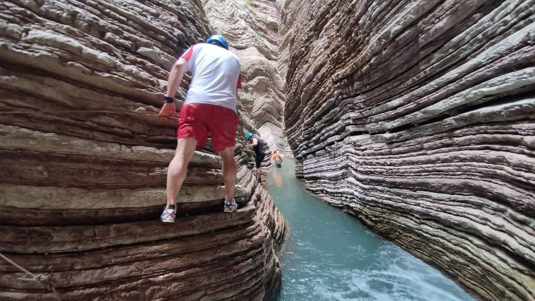 Ζώντας αυτήν την ανεπανάληπτη εμπειρία συνεχίζεις τη διάσχιση του φαραγγιού, πάντα μέσα στο νερό και φτάνεις σε ένα σημείο, όπου το ποτάμι είναι βαθύ (1,5 μέτρο περίπου όταν το πέρασα εγώ) και λίγο ορμητικό. Για να συνεχίσεις χρειάζεται να χρησιμοποιήσεις ένα σκοινί και να αναρριχηθείς (περίπου 2 μέτρα). Ένα πεσμένο δέντρο που έχει σφηνώσει στο άνοιγμα του φαραγγιού, βοηθά στην αναρρίχηση. Είναι προφανές ότι αυτό το τμήμα, καλό είναι κάποιος να το περάσει υπό την εποπτεία έμπειρων ατόμων, όπως συνοδών βουνών, ορειβατών, κ.λπ., κυρίως, όμως, επαγγελματιών.
