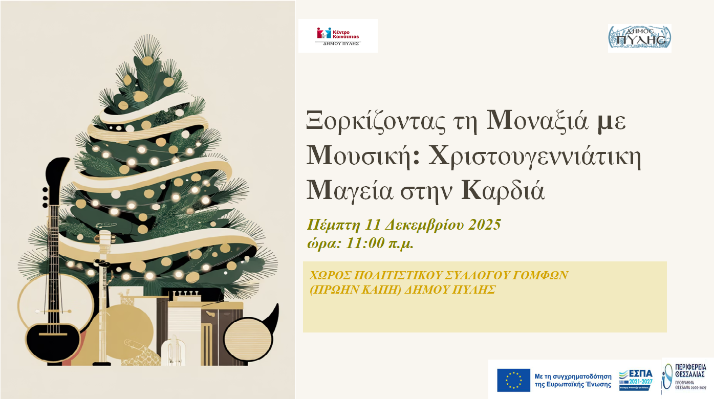 «Ξορκίζοντας τη Μοναξιά με Μουσική» την Πέμπτη 11 Δεκεμβρίου 2025, ώρα 11:00 π. μ., στο χώρο του Πολιτιστικού Συλλόγου Γόμφων (Πρώην ΚΑΠΗ).